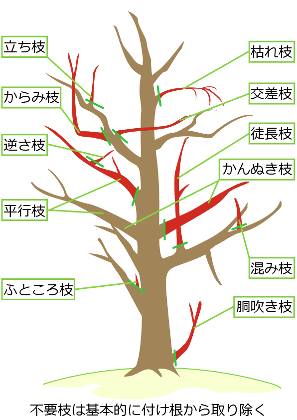 - 徒長枝:細長く伸びて風に弱く、害虫がつきやすい枝。