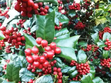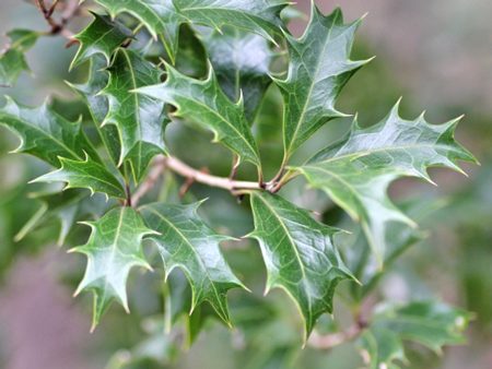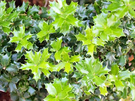 日本原産。節分で使われることで知られ、秋には香りの良い白い花を咲かせます。伝統的な魔除けの植物です。 - セイヨウヒイラギ(モチノキ科)
