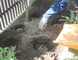 - 根が出たら、根が出た方を下にして土に植える。 ※植える間隔は20センチ以上あける