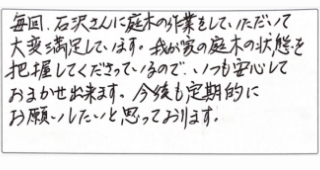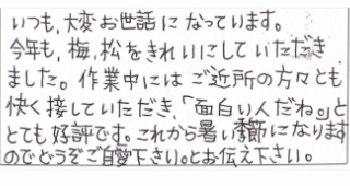 担当植木カットデザイナーが責任をもってお手入れいたします。作業場所がご遠方の場合や、空家、お墓のお手入れなど、お立ち会い無しでの作業も承っております。ご相談ください。