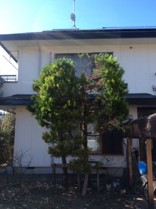 玄関からのアプローチに植えられているゴールドクレストが7mほどの高さにまで達し枝葉も大きく伸ばして生育していました。
