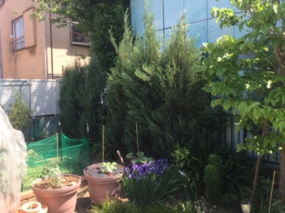 コニファー6本は円錐形の樹形になるように整え、ふところへの日当たりや風通しが良くなるように仕立てました。