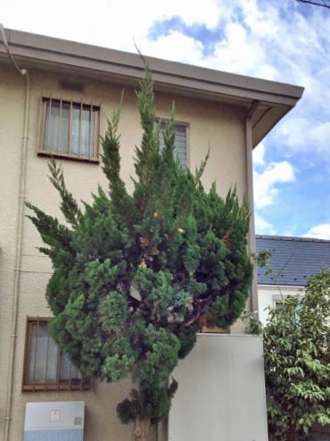 カイヅカイブキの枝が2階の窓を覆いつくすように伸びて、葉が茂っていました。伸びた枝を剪定し、内部の込み合った枝を切り落とし、スッキリ。高さを抑えるように樹形を整えました。